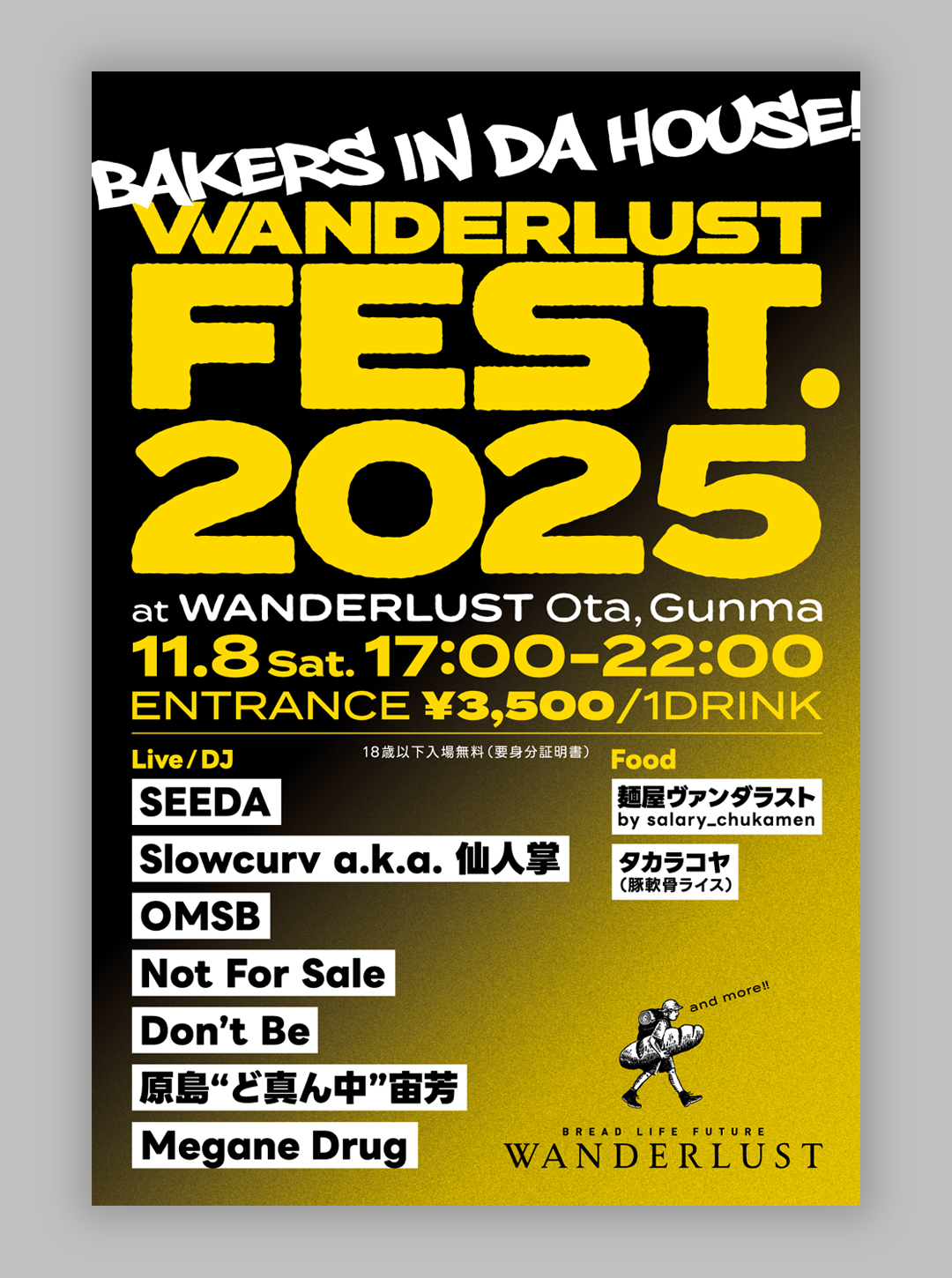 | | Tittle_BAKERS IN DA HOUSE! WANDERLUST FEST. 2025.11.08 Sat. 17:00-22:00 | Client_有限会社マイピア(WANDERLUST) | Art Direction & Design_Masayuki Sato |