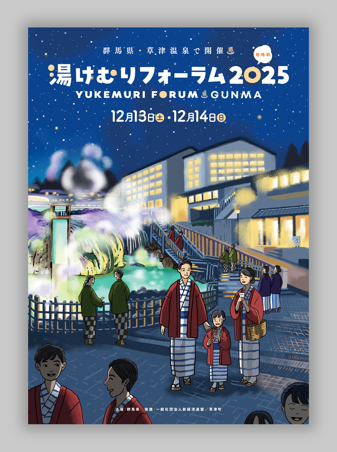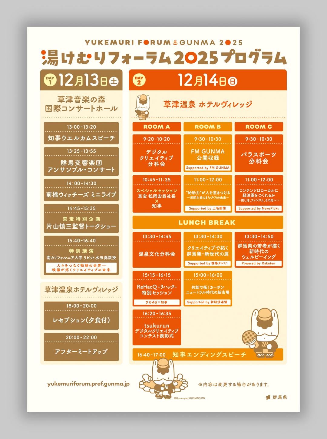 | | Tittle_湯けむりフォーラム2025 A4/案内・スケジュール | Client_群馬県知事戦略部戦略企画課未来創生室 | Art Direction & Design_Masayuki Sato | Illustration_Mami Sato | Illustration(ぐんまちゃん)_中嶋史子 |
