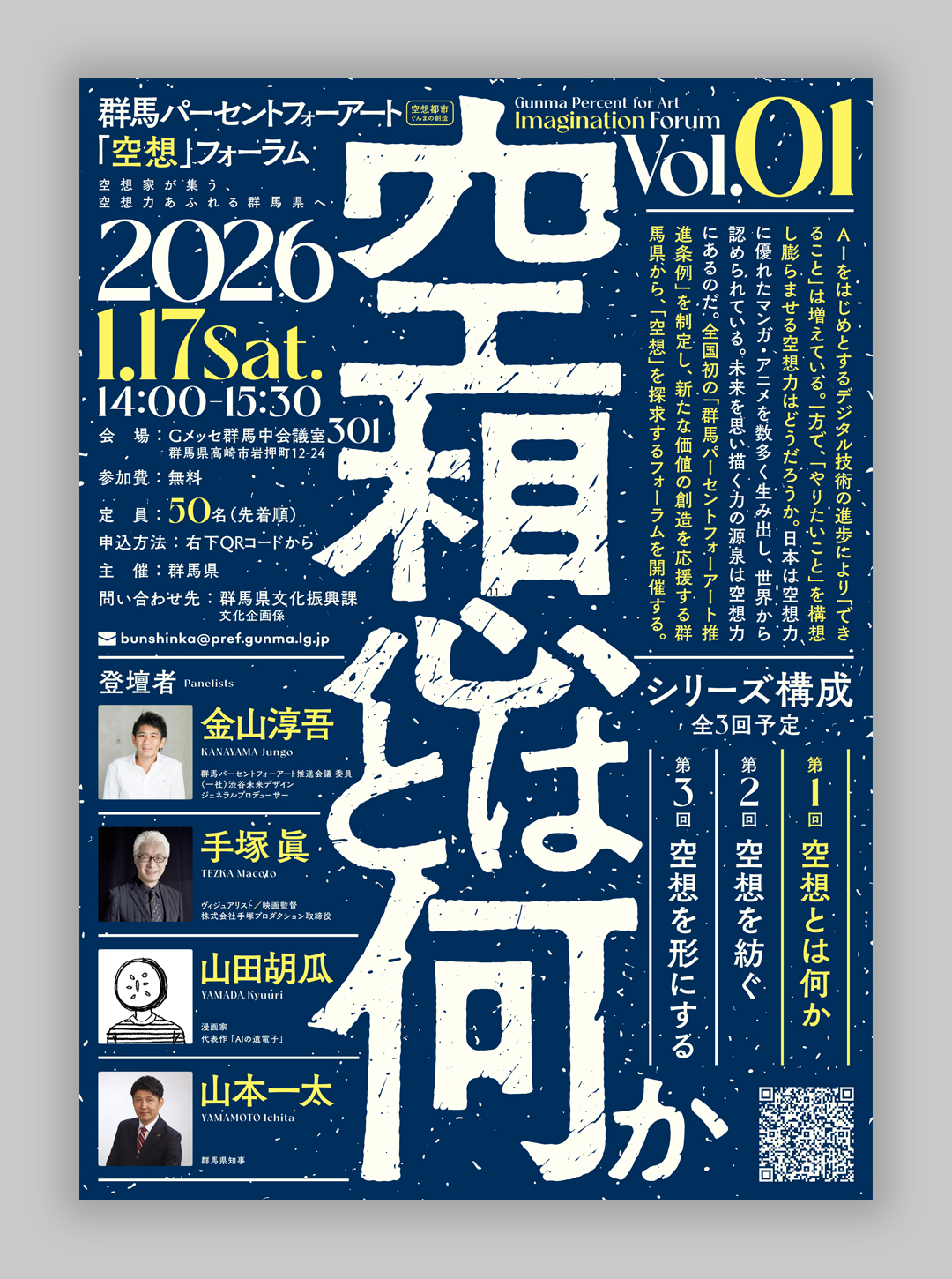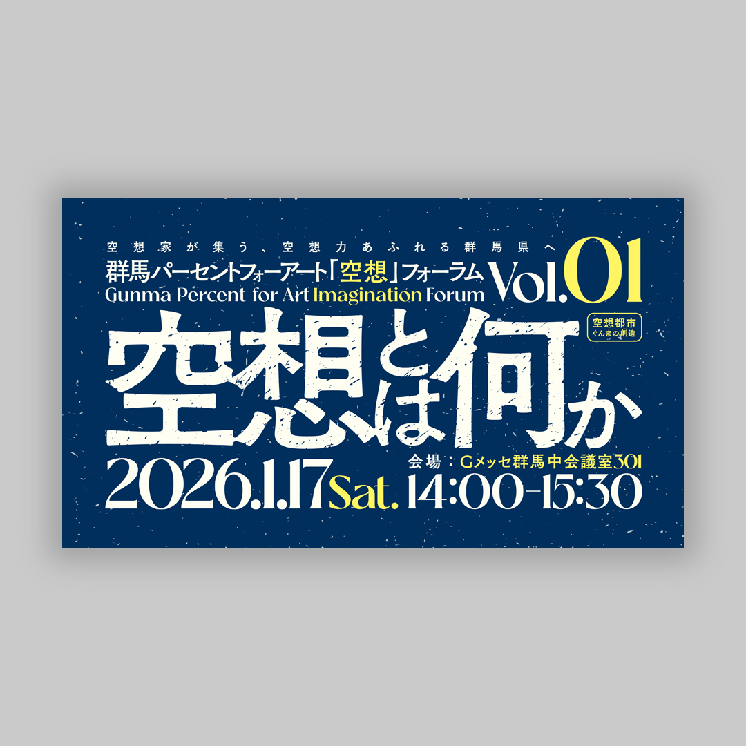 | | Tittle_群馬パーセントフォーアート「空想」フォーラム | 空想都市ぐんまの創造 空想家が集う、空想力あふれる群馬県へ | Vol.1 空想とは何か | A4チラシ・バナー等 | 2026.01.09 | Client_群馬県 地域創生部 文化振興課 文化企画係 | Agency_合同会社 まちの編集社 | Art Direction & Design_Masayuki Sato |