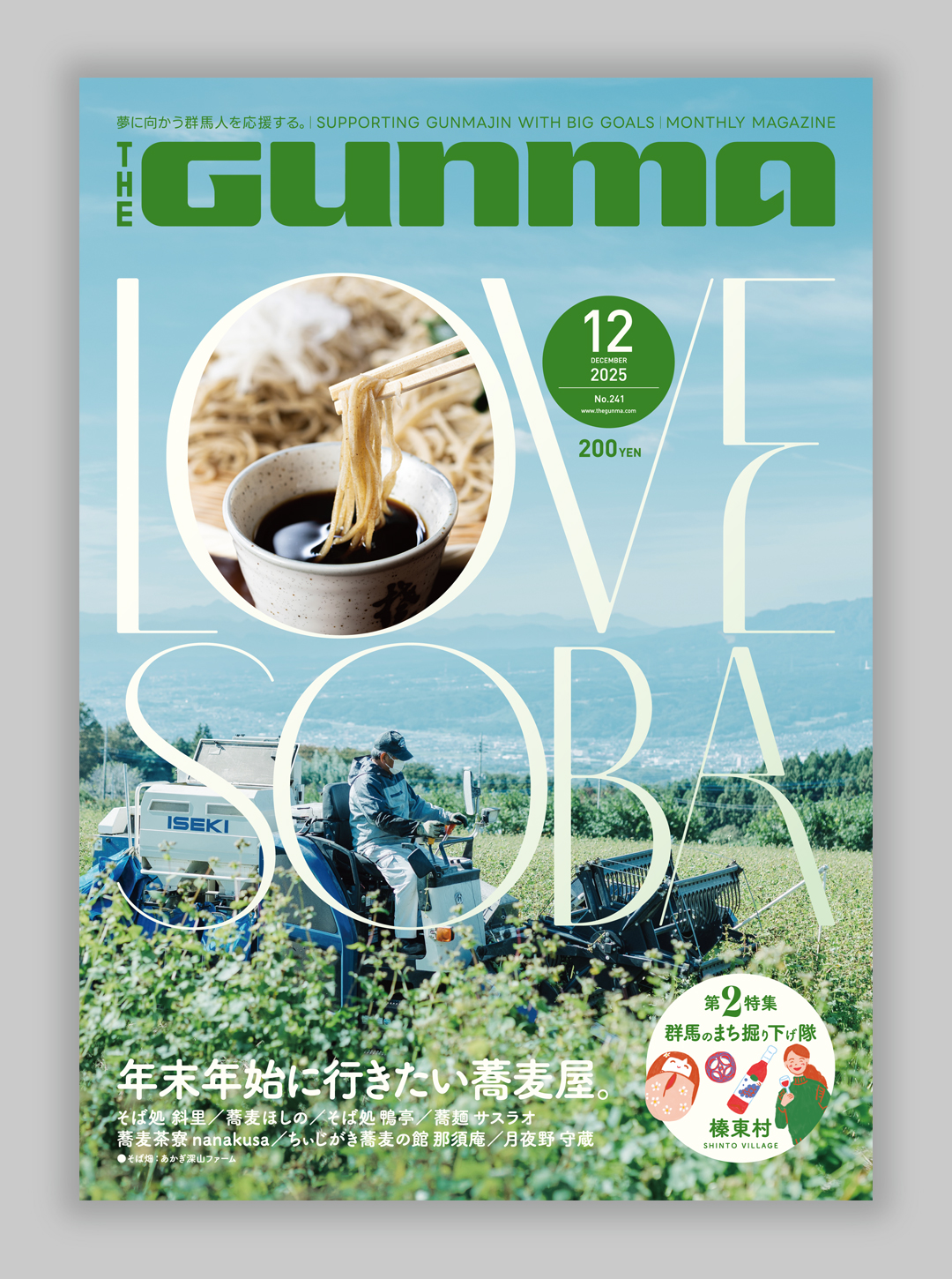 | | Tittle_夢に向かう群馬人を応援する。GUNMAJIN WITH BIG GOALS | MONTHLY MAGAZINE THE GUNMA No.241(12月号)| Cover Design | 2025.11.25発売 | Client_THE GUNMA inc. | Art Direction & Design_Masayuki Sato | Cover Photo_久保木雄(うさぎとカメラ)/蕎麦の写真:内田琢磨 | Illustration_Mami Sato | Location_あかぎ深山ファーム(渋川市) |