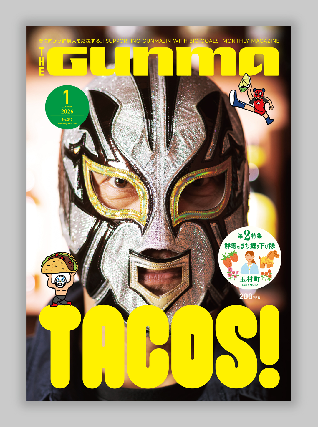 | | Tittle_夢に向かう群馬人を応援する。GUNMAJIN WITH BIG GOALS | MONTHLY MAGAZINE THE GUNMA No.242(2026年1月号)| Cover Design | 2025.12.25発売 | Client_THE GUNMA inc. | Art Direction & Design_Masayuki Sato | Cover Photo_内田琢磨 | Illustration_Mami Sato | Location_覆面カフェ | Model_ミステル・カカオ(覆面カフェ/覆面MANIA) |