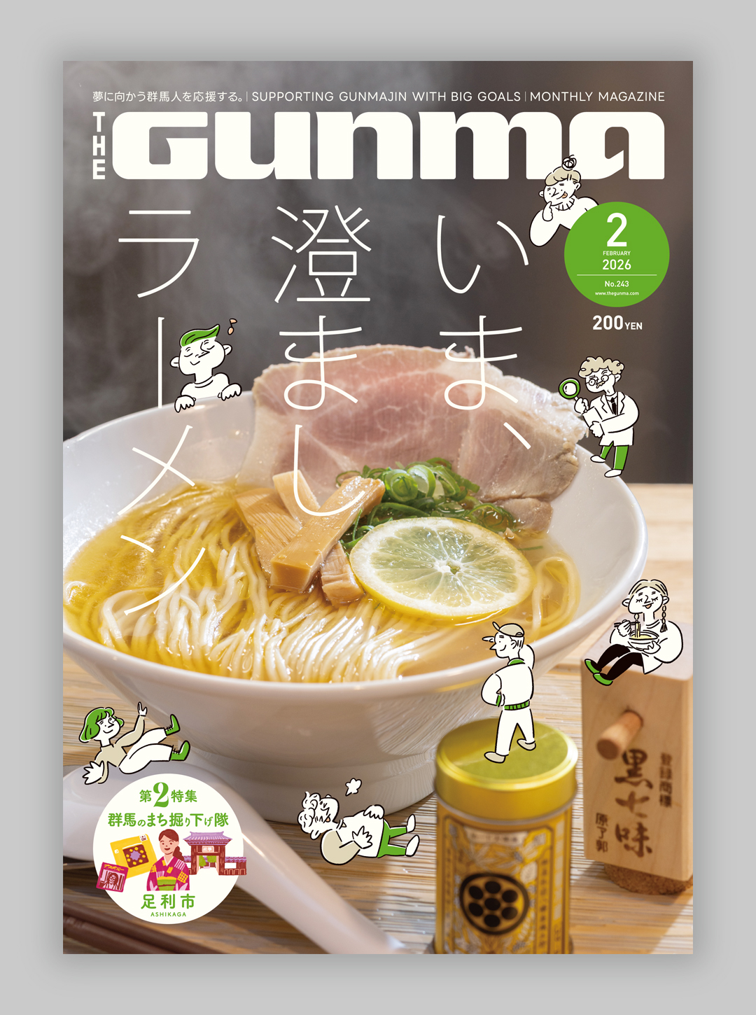 | | Tittle_夢に向かう群馬人を応援する。GUNMAJIN WITH BIG GOALS | MONTHLY MAGAZINE THE GUNMA No.243(2026年2月号)| Cover Design | 2026.1.25発売 | Client_THE GUNMA inc. | Art Direction & Design_Masayuki Sato | Cover Photo_内田琢磨 | Illustration_BUGBUGABOO, Mami Sato | Location_麺屋 松もと(玉村町板井1456-3) |