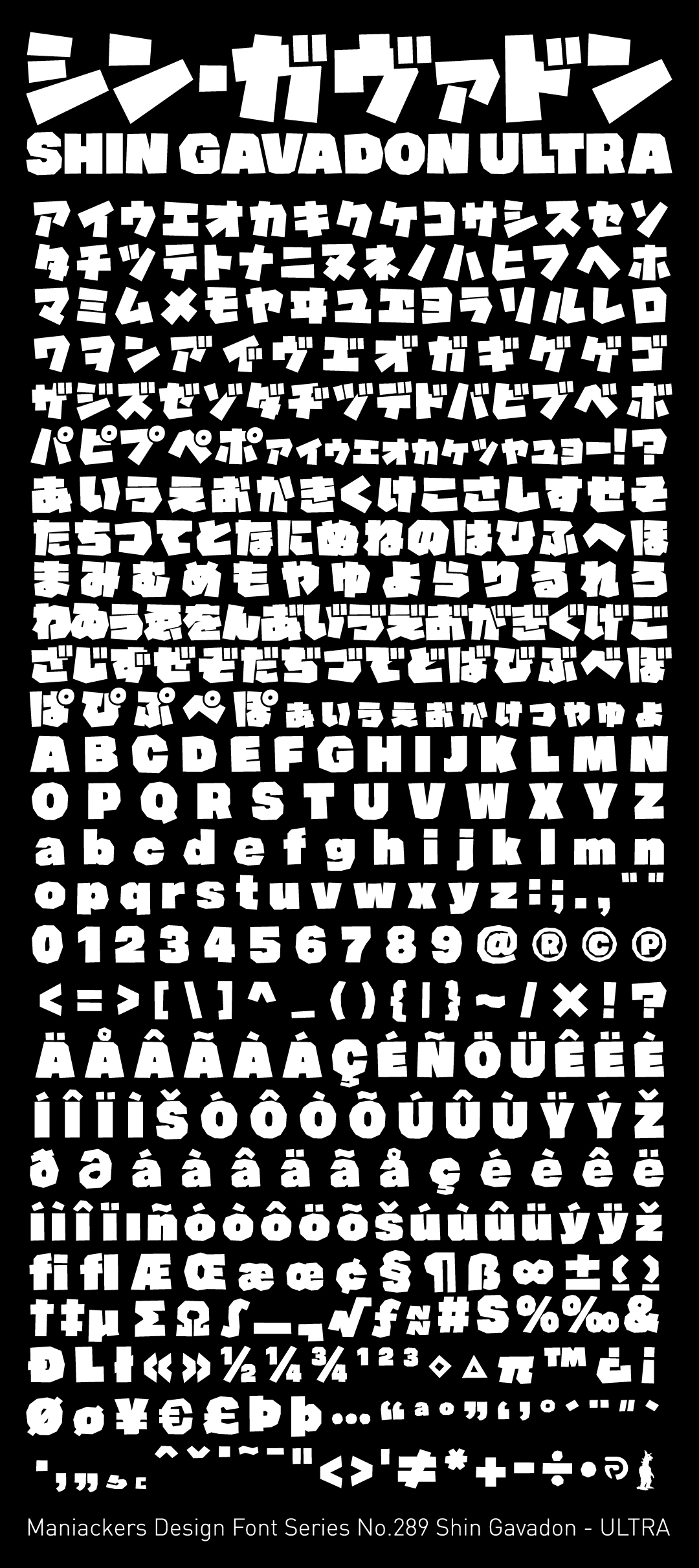 2026.01.20:このフォントをベースに全て作字し直した新作『シン・ガヴァドン - ウルトラ(Shin Gavadon - Ultra)』完成までもうしばらくお待ちください。途中段階のイラストレーターファイルの段階で良いのでちょっと使ってみたい…という方はお問い合わせください。場合によっては提供可能です。